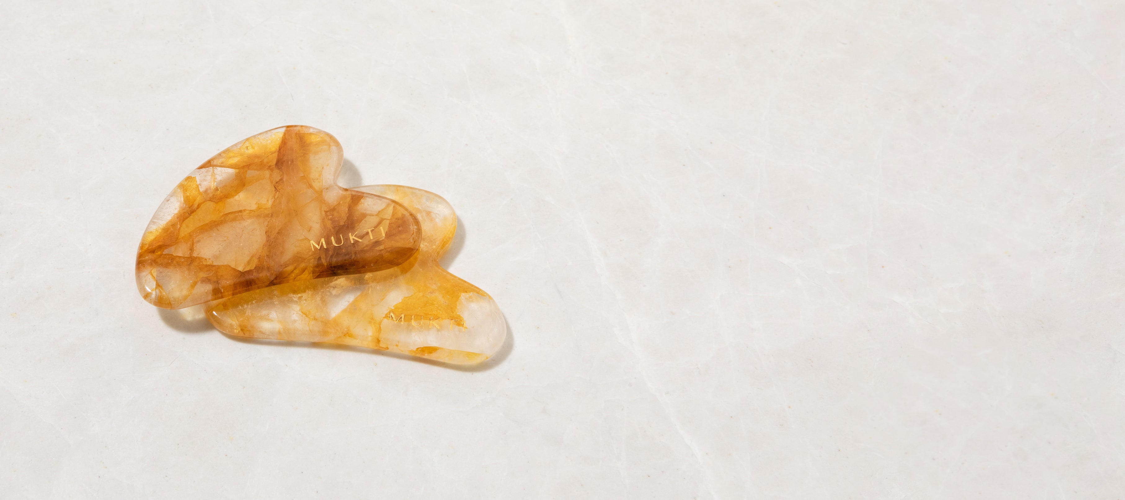 Begin by using the flat edge of the Gua Sha to gently scrape along your jawline and then down your neck. Repeat 10x.